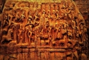 The historical structure is etched with figures and patterns that are quintessential to Hindu mythology and symbolism. The central characters on the left side are of a sage practising penance in a state of meditation standing on one leg; as he is visited by Lord Shiva, accompanied by a group of mythological celestial beings like Kinnaras and Kinnaris (the half bird and half humans), Gandharvas and Apsaras (the musicians and dancers of heaven), and Ganas (the devout followers of Shiva).